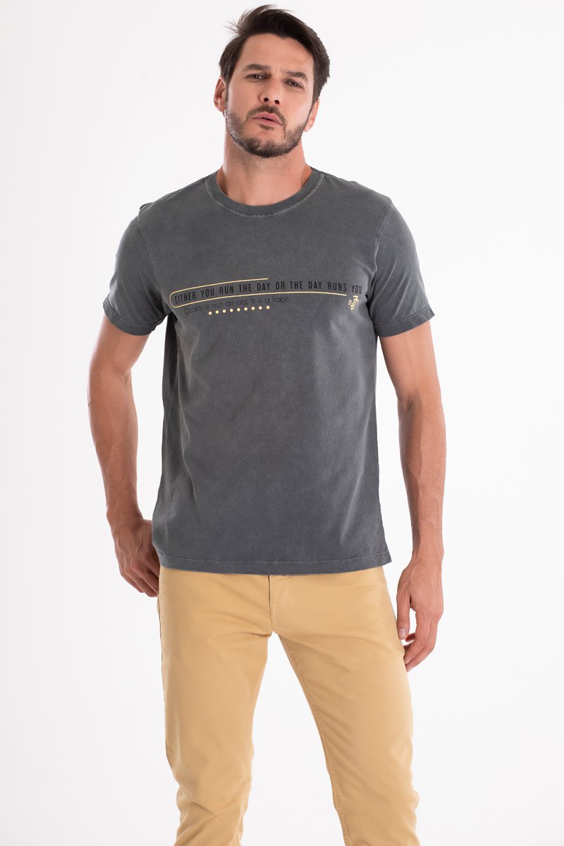A camiseta DZZT Atacama, desenvolvida na cor chumbo estonado, comfere um aspecto desgastado e envelhecido à peça.