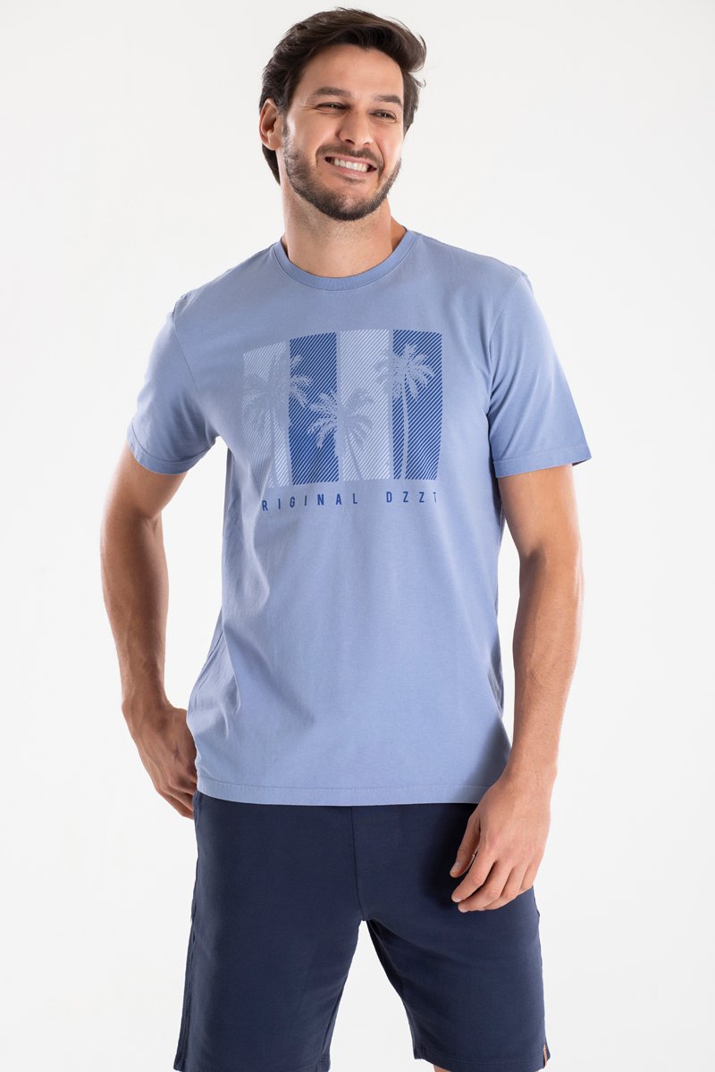 A camiseta Venice Beach foi inspirada no litoral da Califórnia e suas exuberantes paisagens. O azul jeans da peça compõe a temática tropical, lembrando o céu claro e o oceano que são características marcantes da região. Além da estampa comos elementos de palmeiras, muito presentes nas prais.