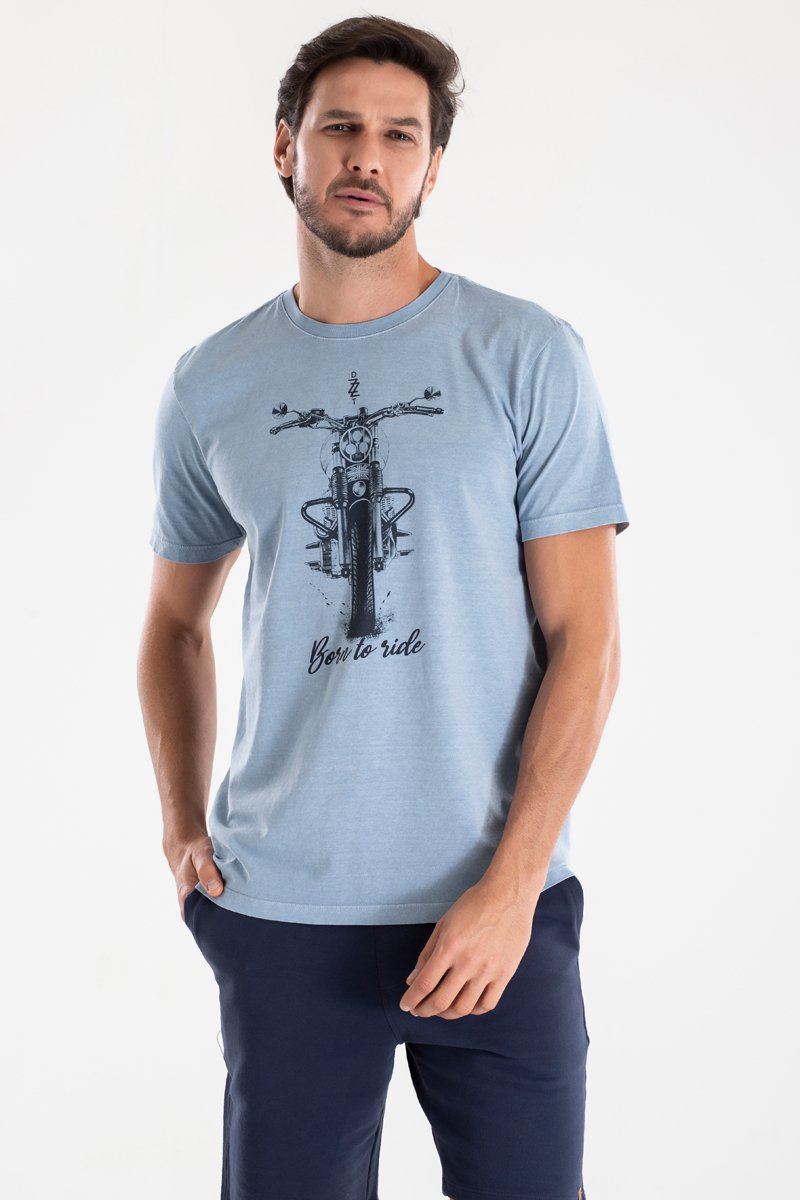 A camiseta DZZT Chicago foi desenvolvida na cor azul jeans estonado, uma cor que transmite liberdade e conforto ao visual. Para compor, sua estampa monocromática inspirada nas viagens de moto pela Rota 66.