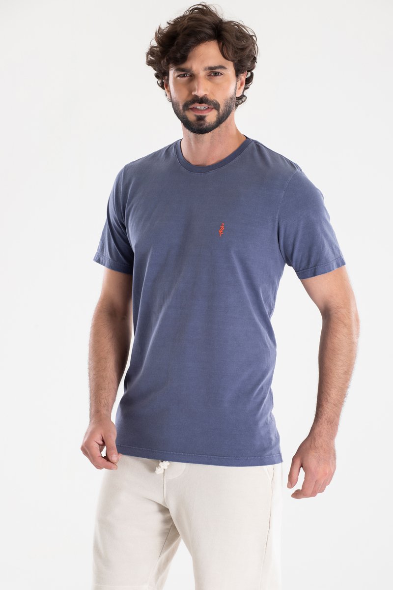 A camiseta DZZT Filipinas faz parte da linha básica. Traz como cor o azul marinho estonado e a logomarca estampada na técnica relevo emborrachado em um tom laranja.