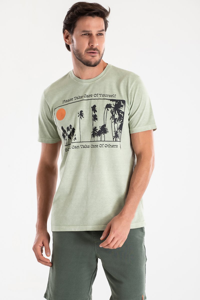 A camiseta DZZT Alagoas foi desenvolvida na cor verde estonado, deixando seu visual com um aspecto de conforto, além de envelhecido e desgastado. A estampa compõe a peça com uma mensagem original e cheia de estilo.