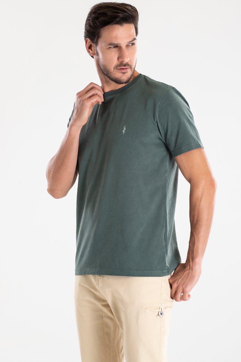 A camiseta DZZT Dinamarca faz parte da linha básica. Traz como cor o verde musgo estonado e a logomarca estampada na técnica relevo emborrachado em um tom verde mais claro.