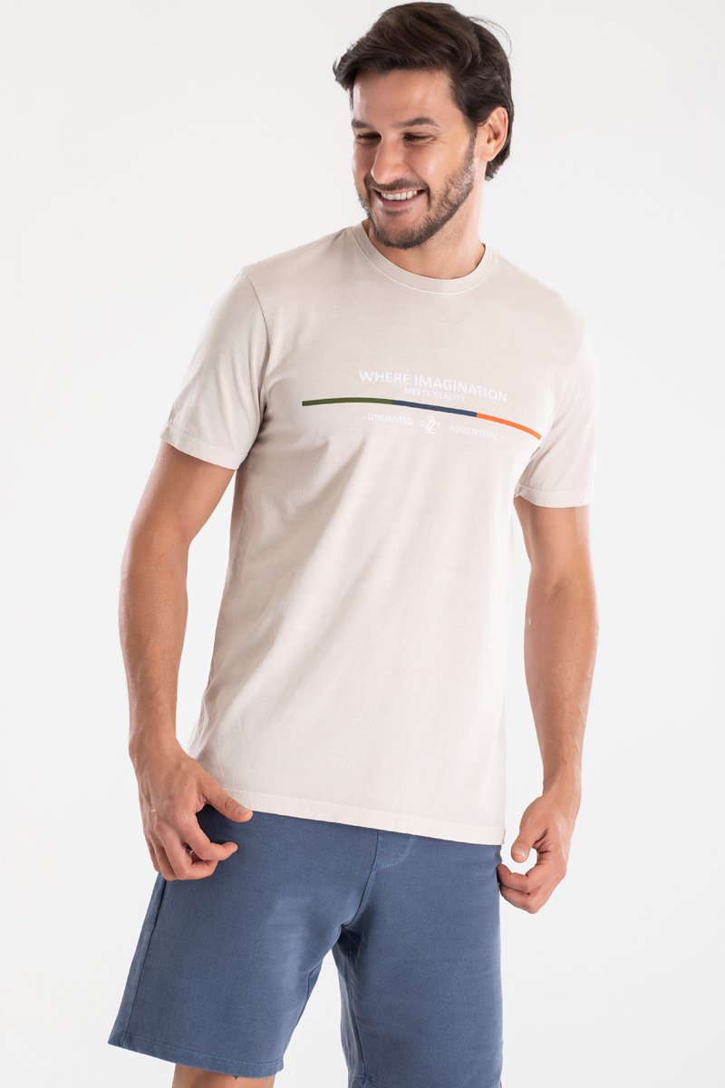 A camiseta DZZT Miami foi desenvolvida na cor natural estonado, tendo como destaque em seu visual uma cor neutra, fácil de combinar com várias composições. Na estampa, tendência lettering, usada para transformar a escrita em arte.