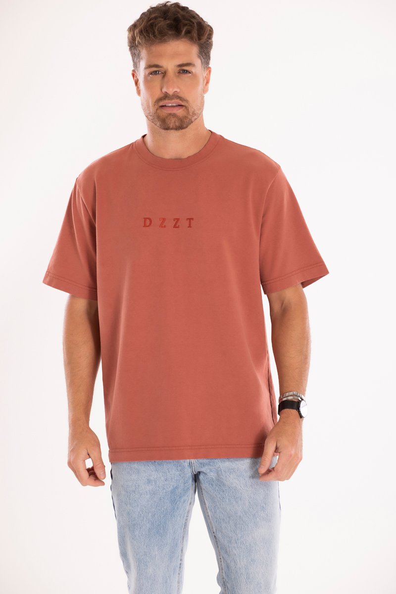 A camiseta Oversized DZZT Notting Hill faz parte da linha Oversized. Traz como cor o Telha e o bordado centralizado em Telha.