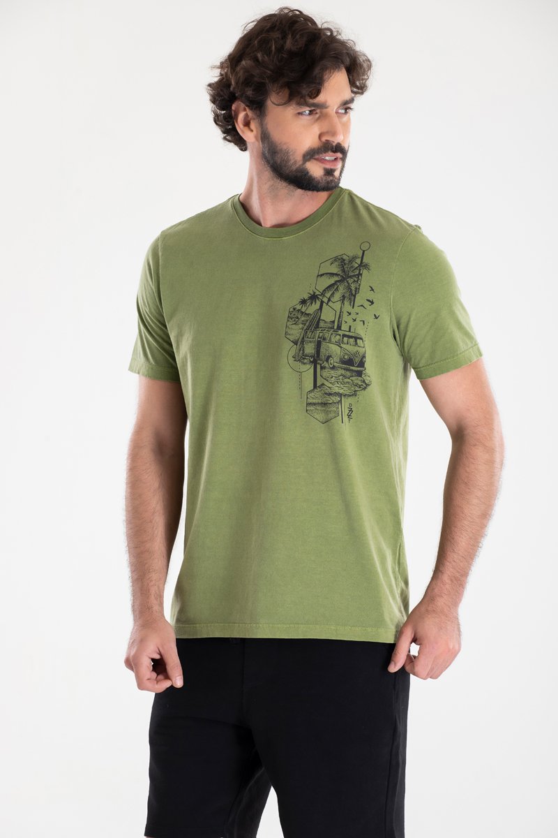 A camiseta DZZT Floripa é desenvolvida com malha 100% algodão, tingida em técnica estonada, com estabilização para não haver encolha e torção no produto após a lavagem.